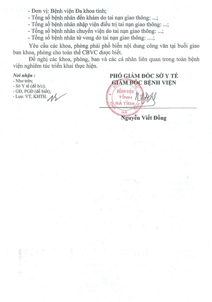 Giám đốc yêu cầu các Khoa, Phòng, Ban phải phổ biến các nội dung trên tại buổi giao ban khoa, phòng cho toàn thể CBVC được biết. Đề nghị các Khoa, Phòng, Ban và các cá nhân liên quan trong toàn bệnh viện nghiêm túc triển khai thực hiện. Có gì vướng mắc báo cáo Ban Giám đốc, trực lãnh đạo để có chỉ đạo kịp thời.