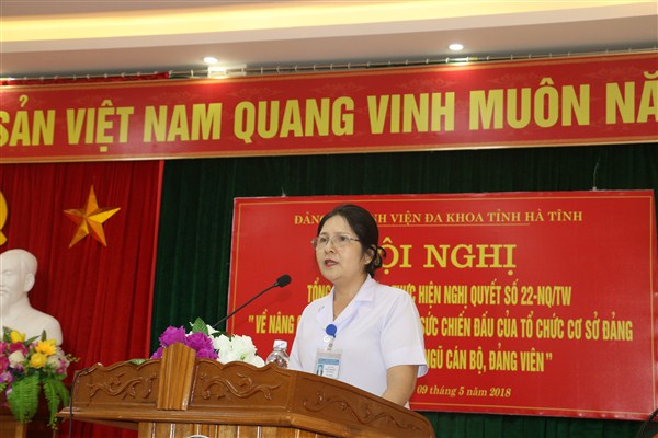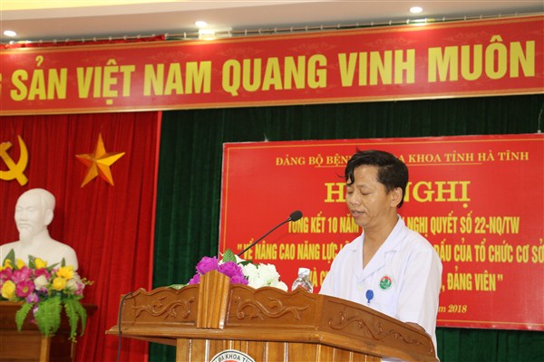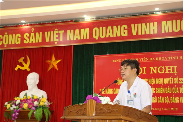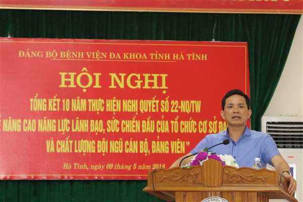 Thực hiện Hướng dẫn chỉ đạo số 08-HD/ĐUK, chiều ngày 09/05/2018, Đảng bộ Bệnh viện Đa khoa tỉnh Hà Tĩnh tổ chức Hội nghị tổng kết 10 năm thực hiện Nghị quyết số 22-NQ/TW ngày 30/01/2008 của Ban chấp hành Trung ương Đảng khóa X “Về nâng cao năng lực lãnh đạo, sức chiến đấu của tổ chức cơ sở đảng và chất lượng đội ngũ cán bộ, đảng viên”.