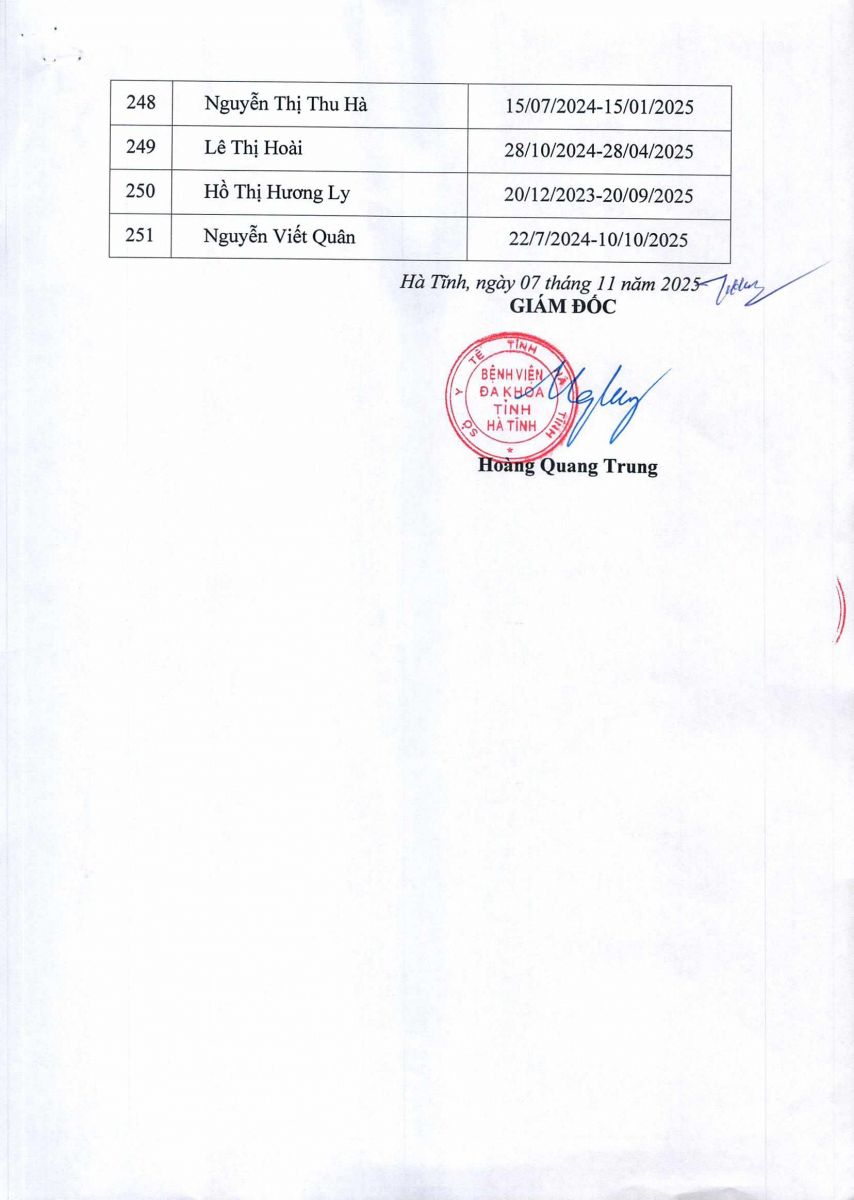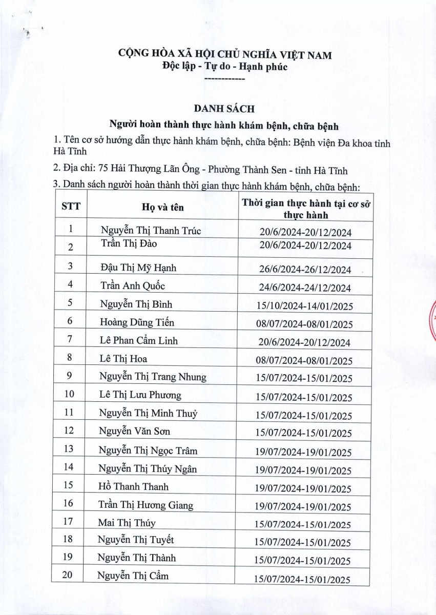 Danh sách người hoàn thành thực hành khám bệnh, chữa bệnh tại Bệnh viện Đa khoa tỉnh Hà Tĩnh 07/11/2025