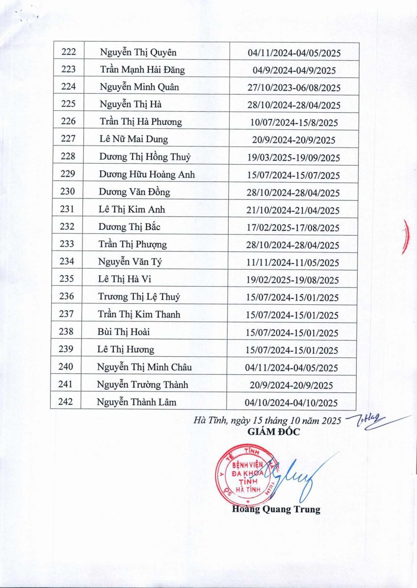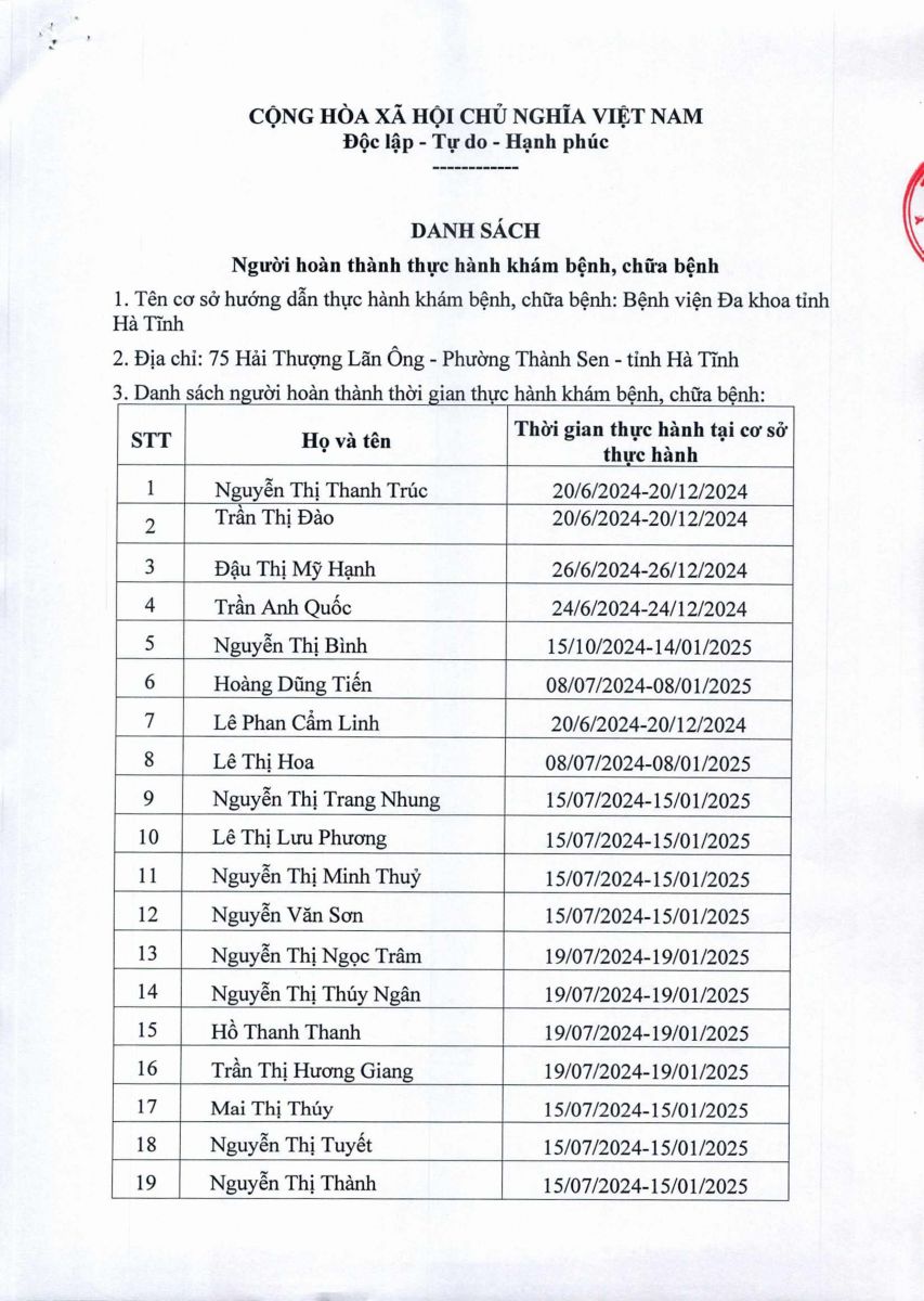 Danh sách người hoàn thành thực hành khám bệnh, chữa bệnh tại Bệnh viện Đa khoa tỉnh Hà Tĩnh 15/10/2025