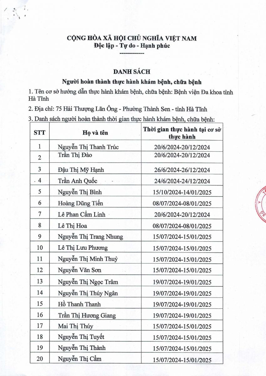 Danh sách người hoàn thành thực hành khám bệnh, chữa bệnh tại Bệnh viện Đa khoa tỉnh Hà Tĩnh 26/11/2025