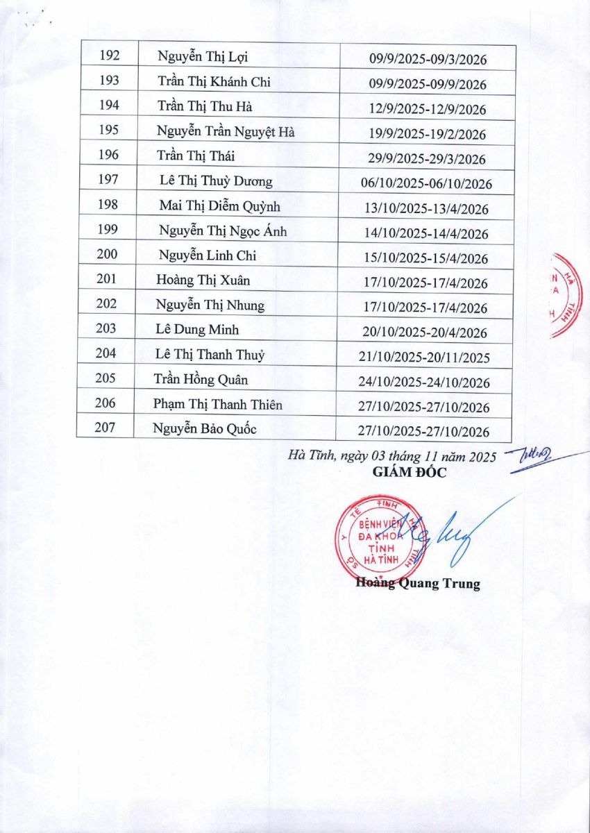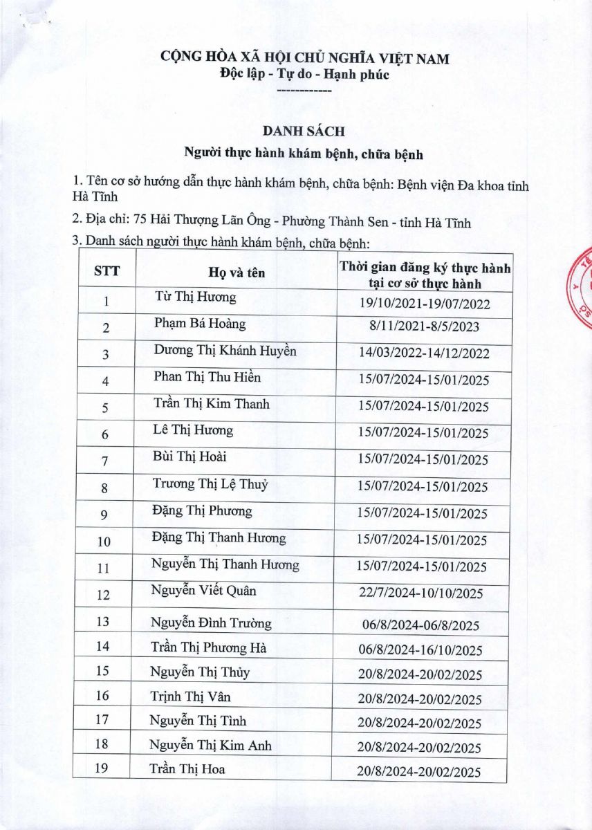 Danh sách người thực hành khám bệnh, chữa bệnh tại Bệnh viện Đa khoa tỉnh Hà Tĩnh 03/11/2025