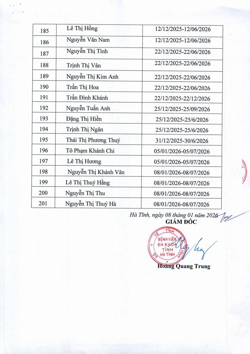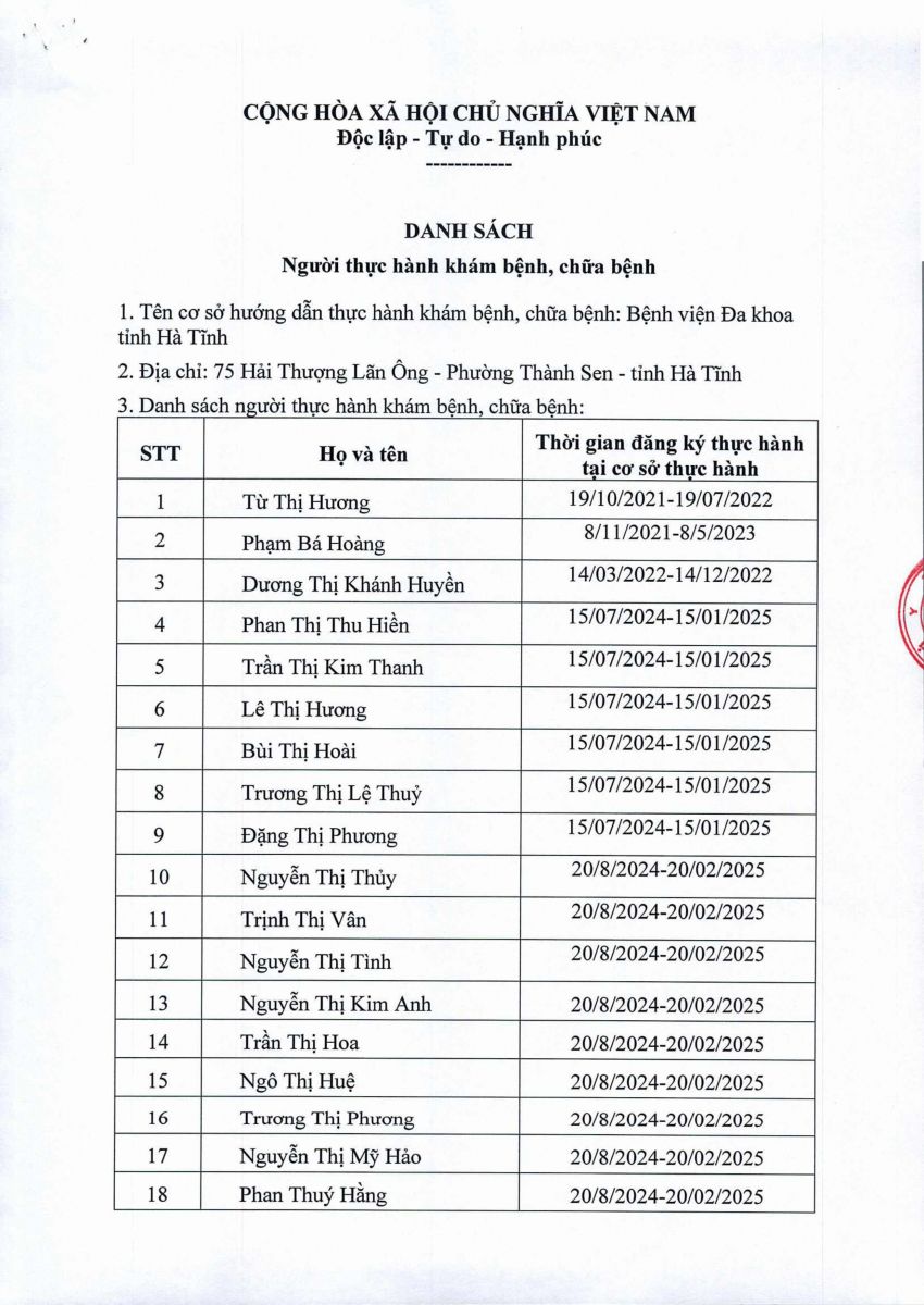 Danh sách người thực hành khám bệnh, chữa bệnh tại Bệnh viện Đa khoa tỉnh Hà Tĩnh 08/1/2026