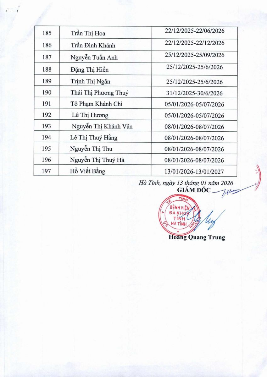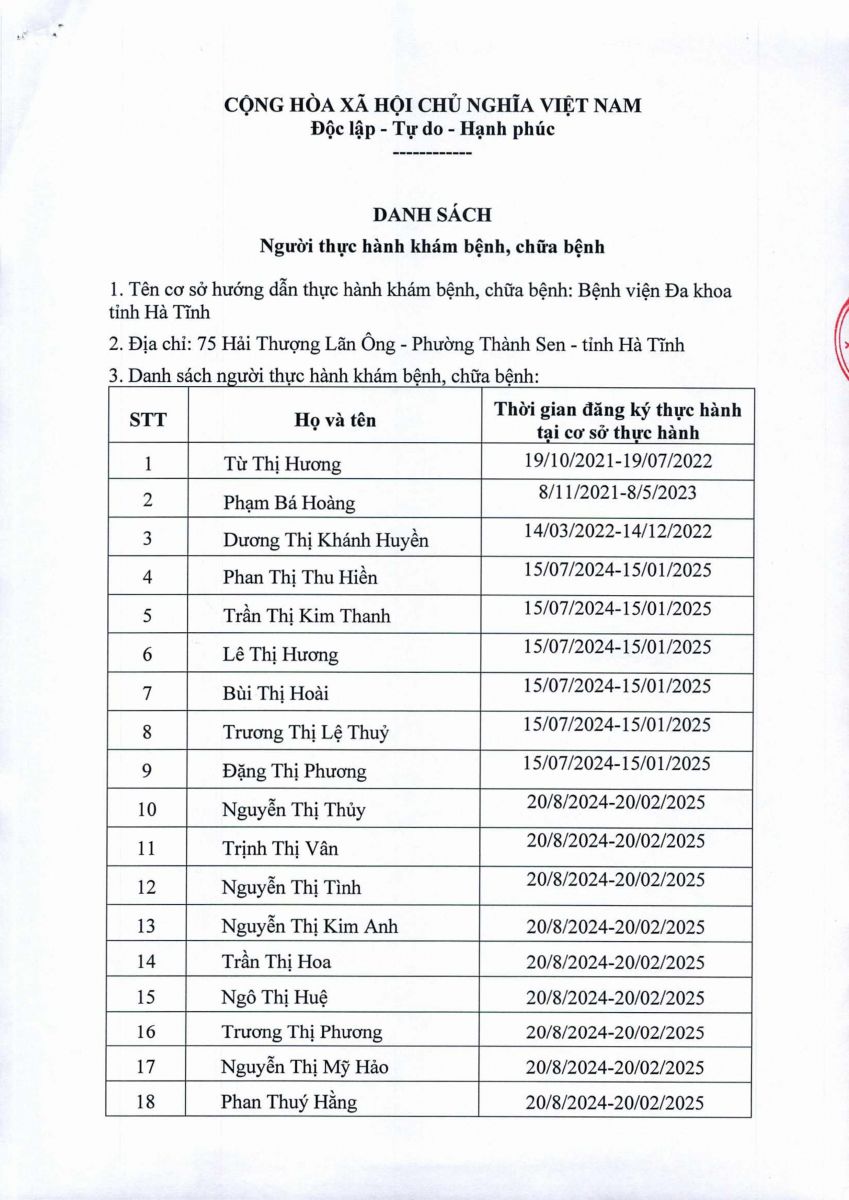 Danh sách người thực hành khám bệnh, chữa bệnh tại Bệnh viện Đa khoa tỉnh Hà Tĩnh 13/1/2026