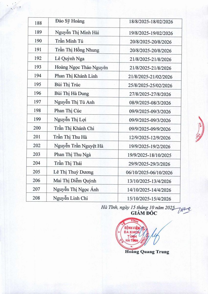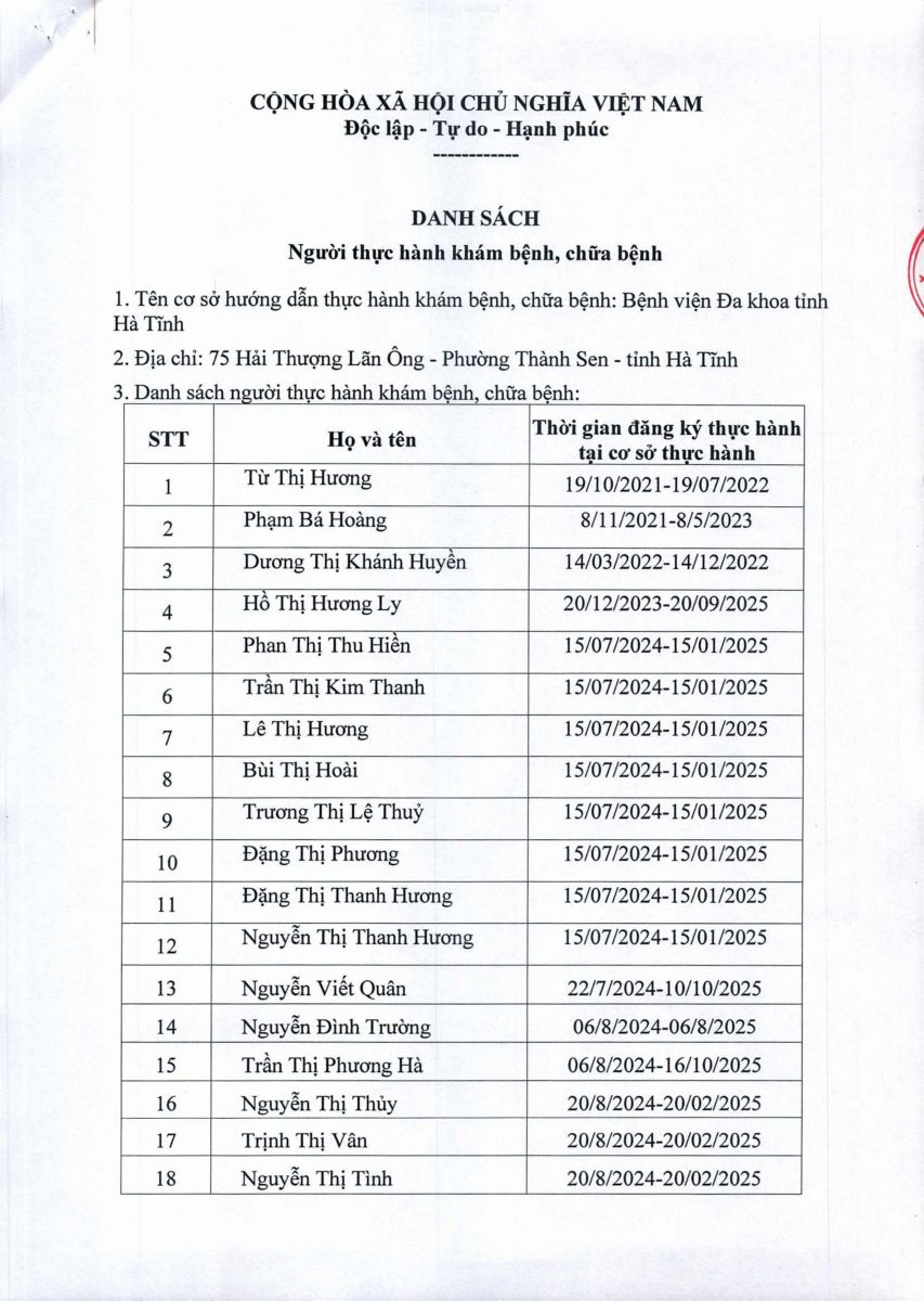 Danh sách người thực hành khám bệnh, chữa bệnh tại Bệnh viện Đa khoa tỉnh Hà Tĩnh 15/10/2025