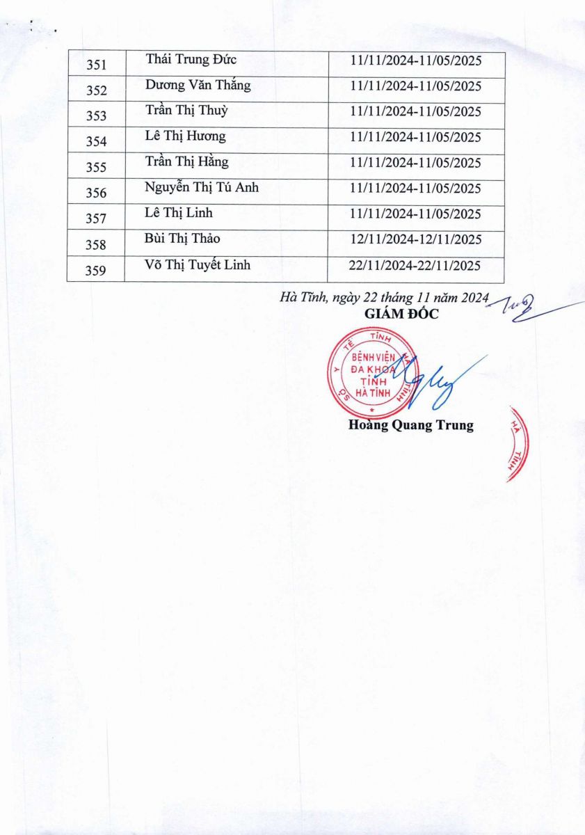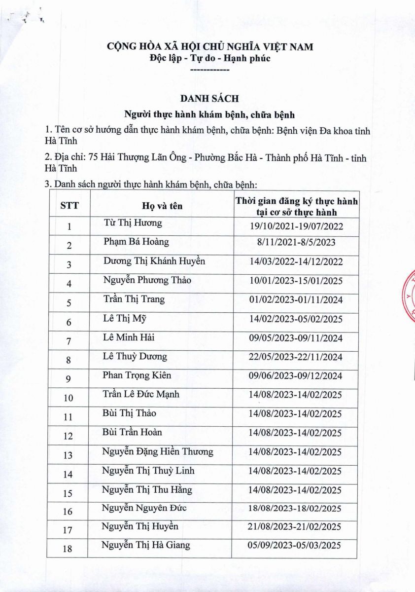 Danh sách người thực hành khám bệnh, chữa bệnh tại Bệnh viện Đa khoa tỉnh Hà Tĩnh 22/11/2024