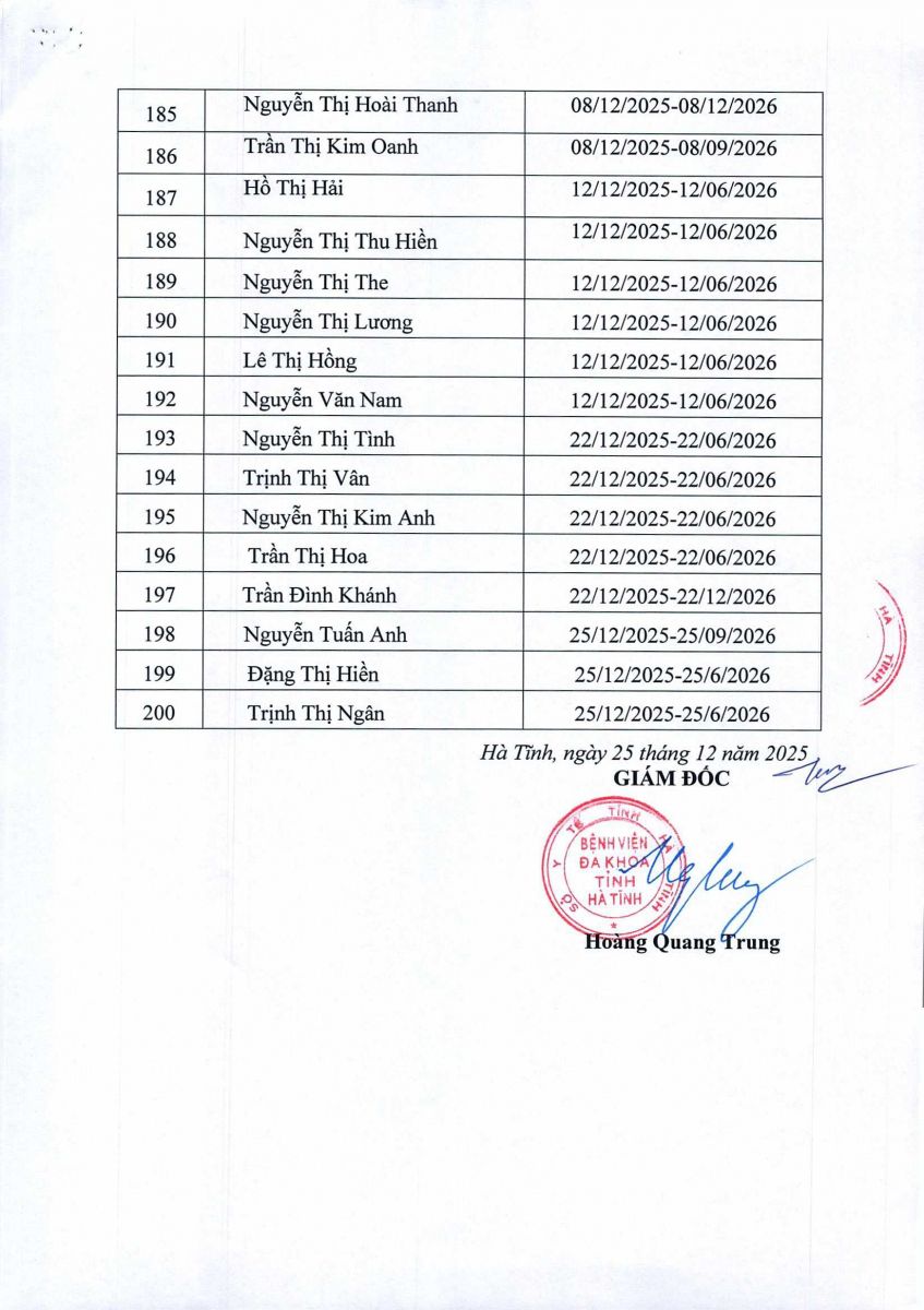 Danh sách người thực hành khám bệnh, chữa bệnh tại Bệnh viện Đa khoa tỉnh Hà Tĩnh 25/12/2025