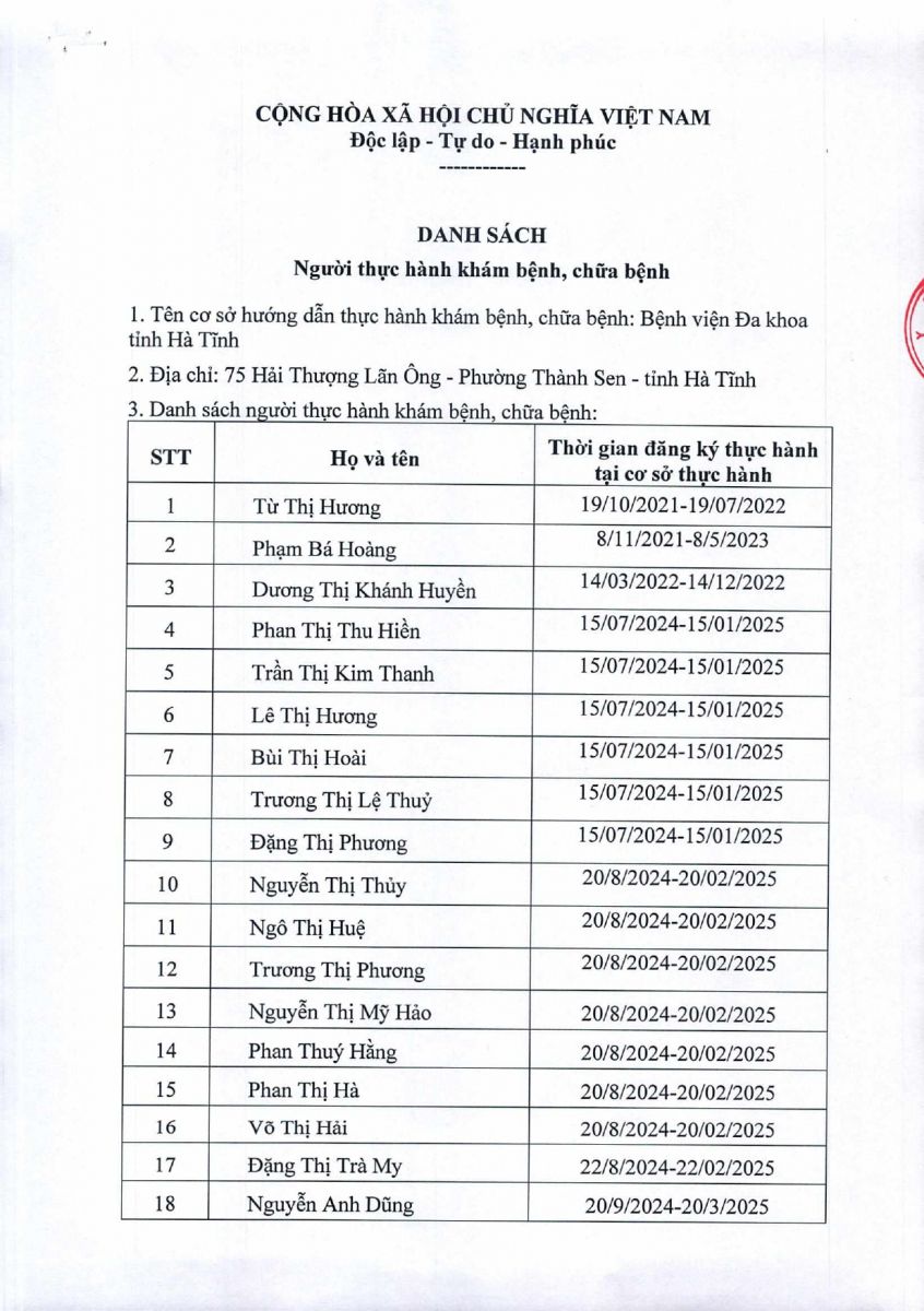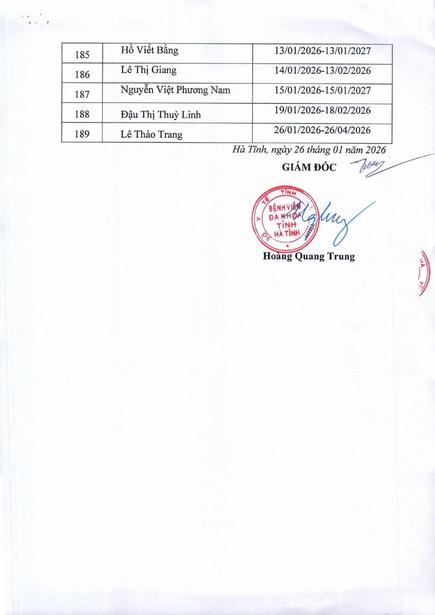 Danh sách người thực hành khám bệnh, chữa bệnh tại Bệnh viện Đa khoa tỉnh Hà Tĩnh 26/1/2026
