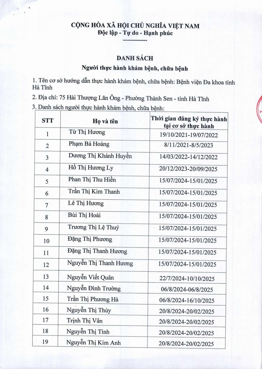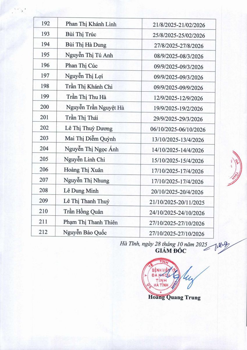 Danh sách người thực hành khám bệnh, chữa bệnh tại Bệnh viện Đa khoa tỉnh Hà Tĩnh 28/10/2025