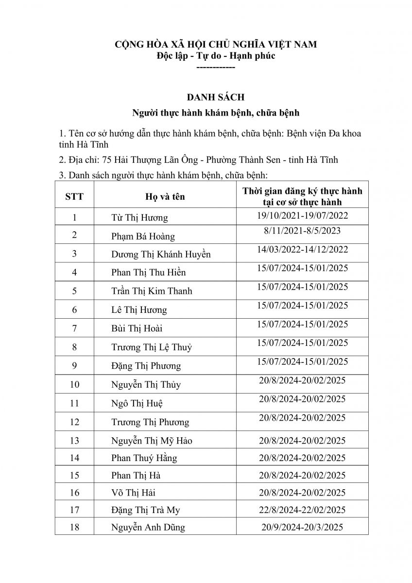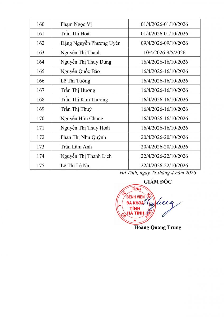 Danh sách người thực hành khám bệnh, chữa bệnh tại Bệnh viện Đa khoa tỉnh Hà Tĩnh 28/4/2026