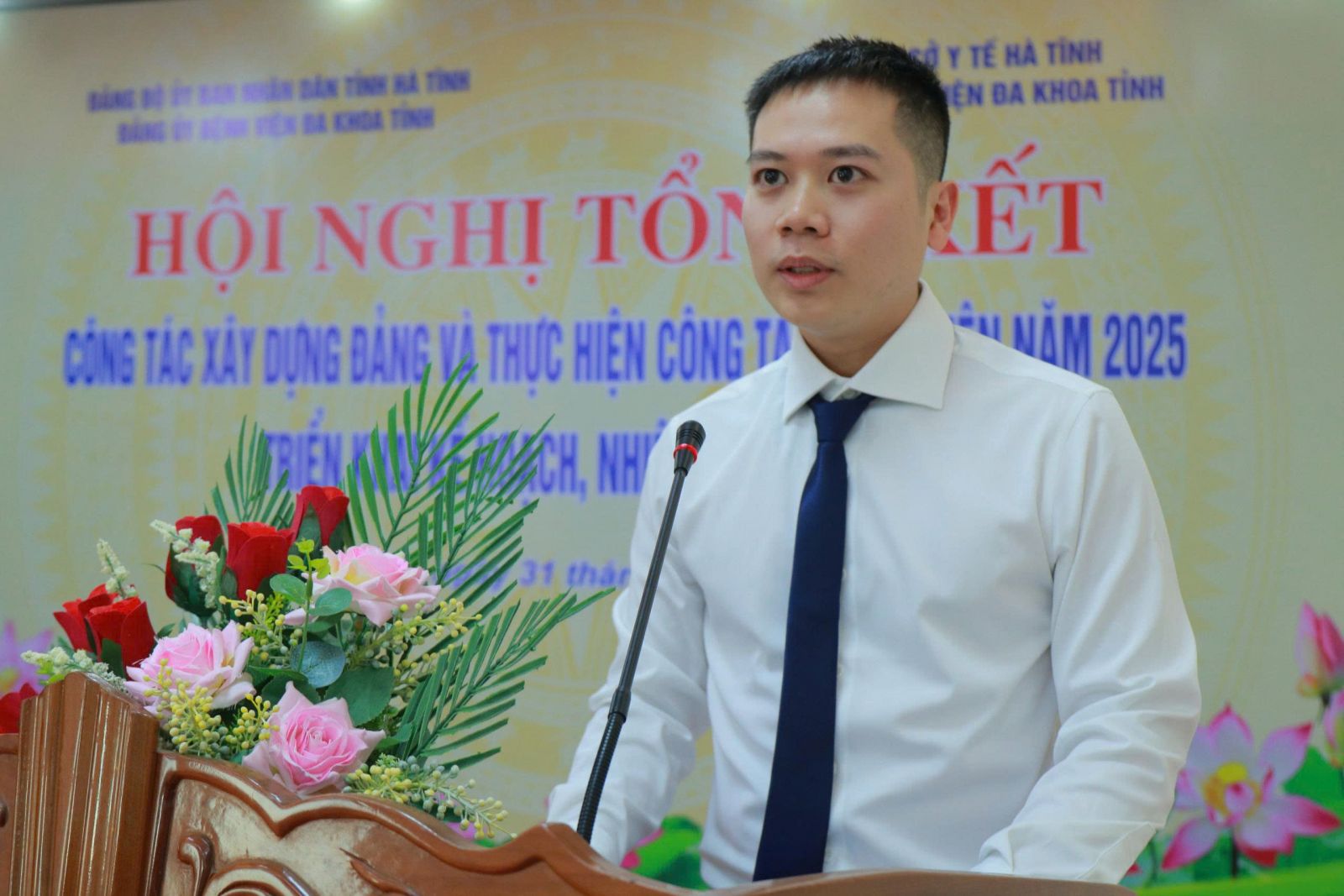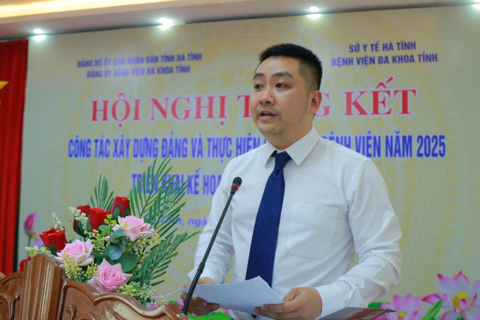 Đồng chí Tôn Đức Quý, Phó Giám đốc Bệnh viện trình bày báo cáo tổng kết công tác Đảng năm 2025 tại Hội nghị