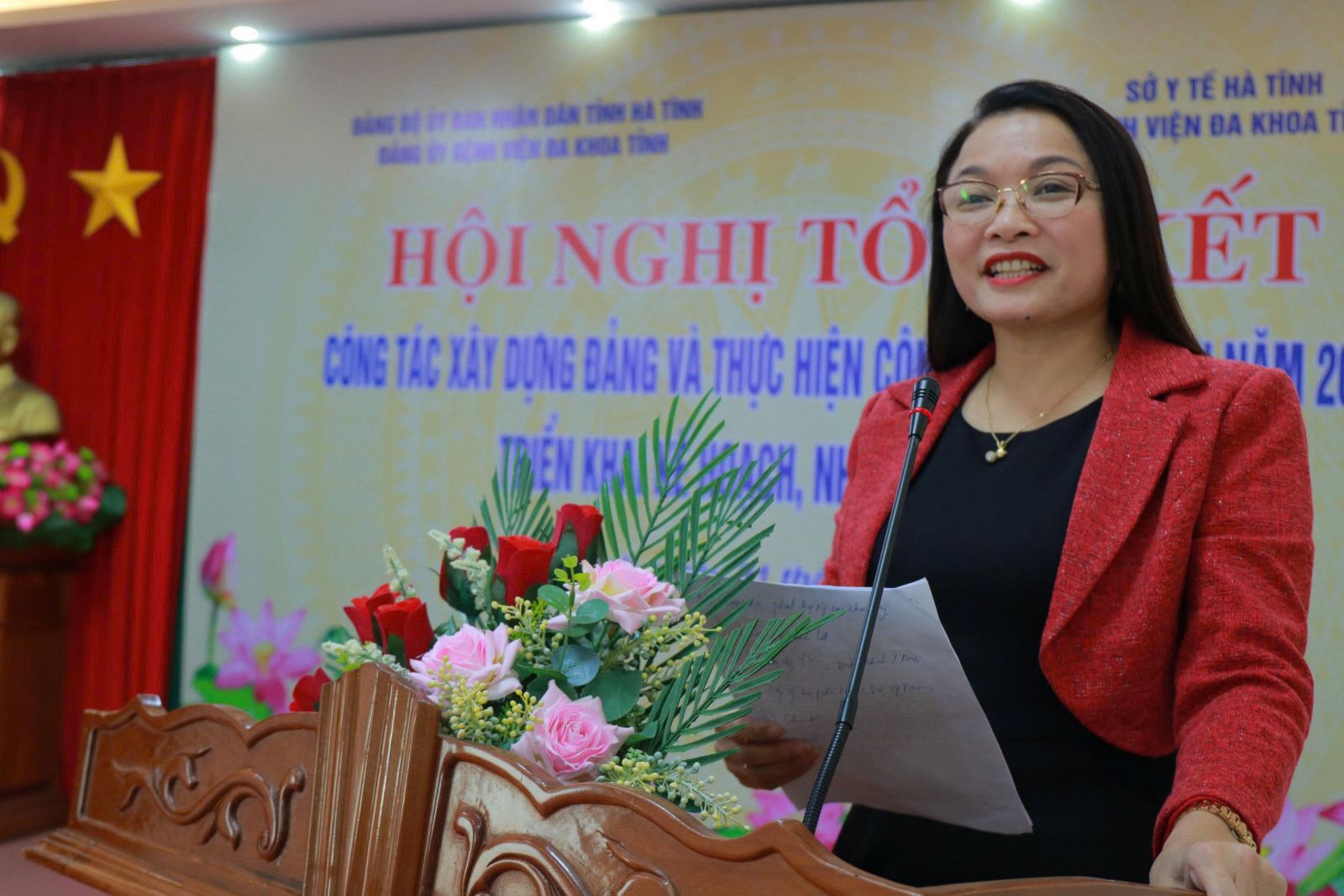 Phát biểu kết luận Hội nghị, đồng chí Nguyễn Thị Hà Tân, Ủy viên BCH Đảng bộ tỉnh, Phó Bí thư chuyên trách Đảng ủy UBND tỉnh đã chúc mừng và đánh giá cao các kết quả mà BVĐK tỉnh đạt được trong thời gian qua. Đồng chí hi vọng thời gian tới, bệnh viện sẽ chú trọng công tác phát triển đảng viên, nâng cao chất lượng chi bộ cơ sở, xây dựng Đảng bộ Bệnh viện trong sạch, vững mạnh, tiếp tục nâng cao chất lượng khám chữa bệnh, triển khai các kỹ thuật mới nhằm đáp ứng nhu cầu khám chữa bệnh ngày càng cao của người dân, đồng thời cải thiện đời sống cho CBVC Bệnh viện.