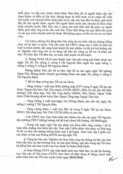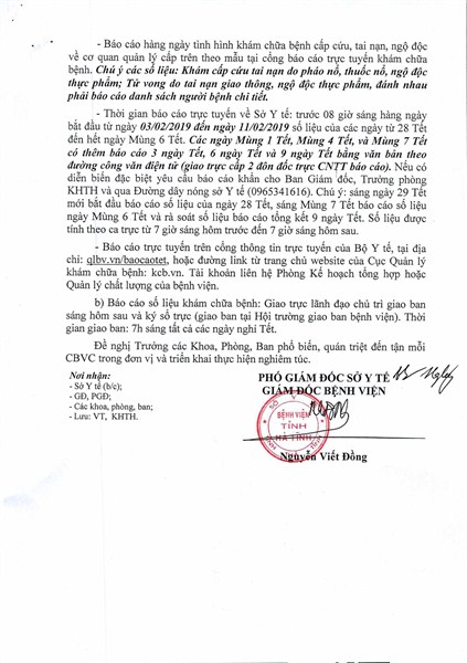 Phát biểu kết luận, đồng chí Nguyễn Viết Đồng nhấn mạnh: Để bảo đảm tốt công tác khám, chữa bệnh cho nhân dân trong dịp Tết Kỷ Hợi, yêu cầu toàn thể cán bộ, viên chức Bệnh viện nghiêm túc chấp hành theo công văn số 75, đồng thời mỗi khoa, phòng và mỗi cán bộ, viên chức cần phải chủ động, nỗ lực hết mình trong công tác chăm sóc sức khỏe nhân dân. Luôn luôn sẵn sàng về nhân lực, vật lực đáp ứng tốt nhu cầu, nhiệm vụ khi có các tình huống như: thảm họa, tai nạn hàng loạt... xảy ra trên địa bàn, bảo đảm phục vụ một cách tốt nhất nhu cầu khám chữa bệnh của nhân dân và khi có sự điều động của cấp trên.