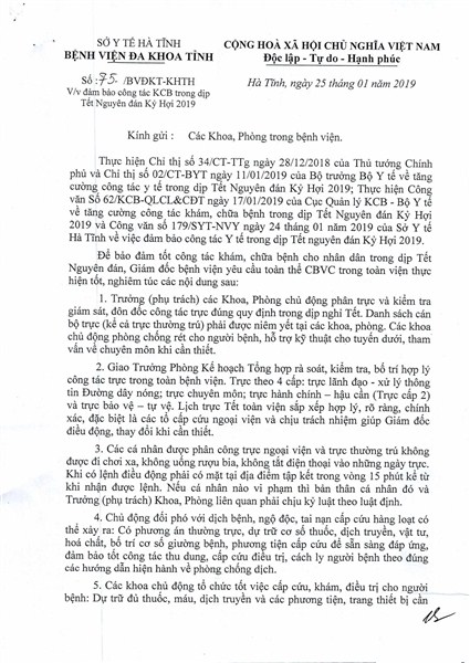 Tại cuộc họp, Ths.Bs Lê Ngọc Thanh, Trưởng phòng Kế hoạch Tổng hợp đã phổ biến chi tiết nội dung Công văn số 179/SYT-NVY của Sở Y tế ngày 24/01/2019 và Công văn số 75/BVĐKT-KHTH của Bệnh viện Đa khoa tỉnh ngày 25/01/2019 về việc đảm bảo công tác khám, chữa bệnh trong dịp Tết Nguyên đán Kỷ Hợi 2019. Đồng chí đã nêu rõ, kỳ nghỉ Tết kéo dài 9 ngày, từ ngày 02/02 đến hết ngày 10/02, các cán bộ, viên chức cần lưu ý một số điểm trong công tác trực tại các khoa, phòng và các cấp trực trong toàn viện, chủ động lên kế hoạch cụ thể, tránh bị động khi được điều động trong các ngày nghỉ lễ.