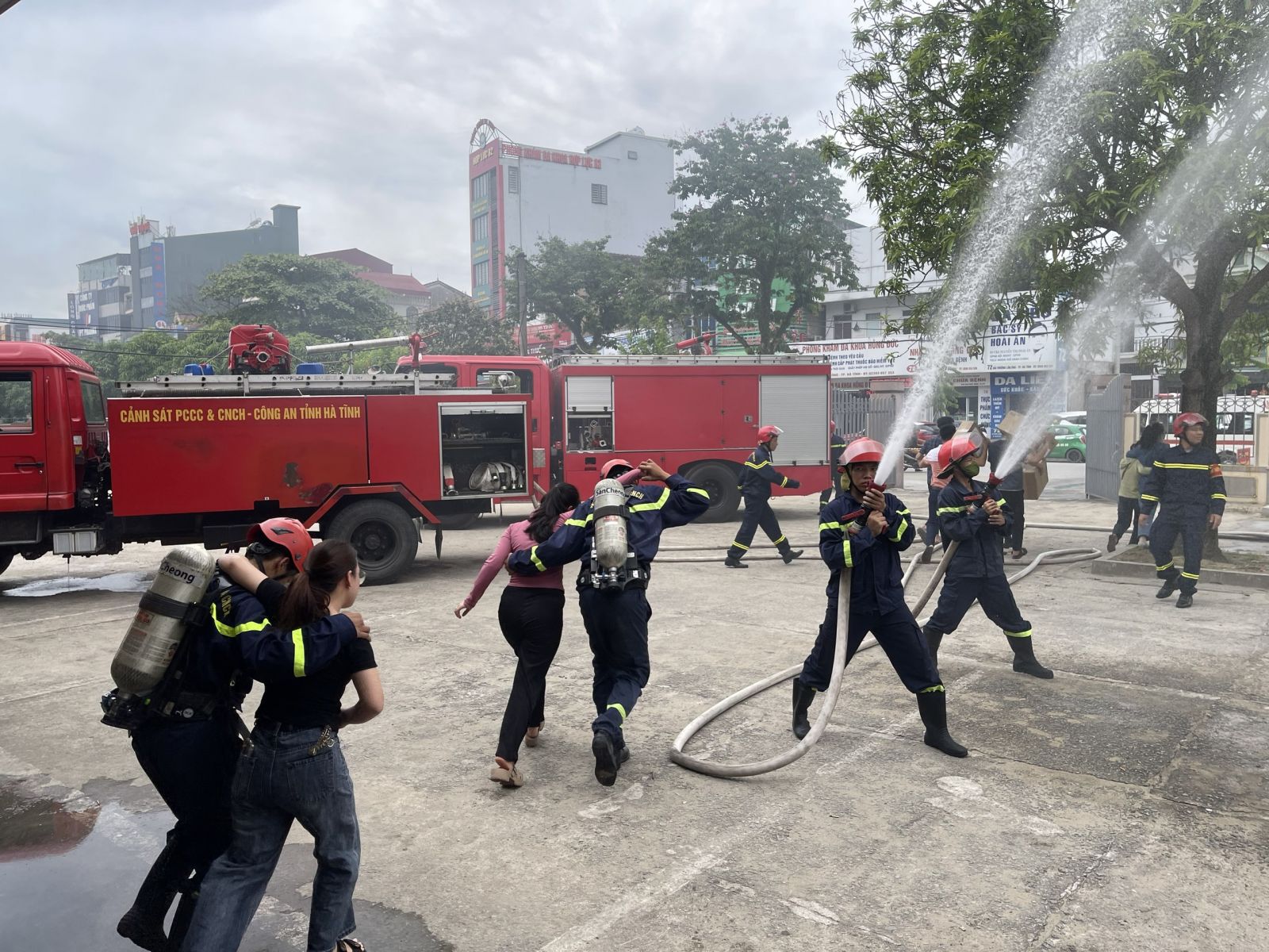 Ngoài ra, Phòng Cảnh sát PCCC&CNCH phối hợp với Bệnh viện Đa khoa tỉnh Hà Tĩnh đã tổ chức diễn tập phương án PCCC&CNCH. Tình huống giả định xảy ra cháy lớn, nhân viên của Bệnh viện đã gọi điện báo cháy cho lực lượng chữa cháy chuyên nghiệp, Ban lãnh đạo Bệnh viện đã chỉ đạo nhân viên vận chuyển bệnh nhân, sơ tán tài sản và thực hiện các phương án tại chỗ ban đầu... Do có sự chuẩn bị chu đáo, trách nhiệm cao của mỗi học viên, cùng với sự hướng dẫn nhiệt tình, chu đáo và phối hợp nhịp nhàng của lực lượng PCCC&CNCH chuyên nghiệp, đám cháy đã được dập tắt, bảo vệ an toàn về con người và tài sản của Bệnh viện, buổi diễn tập diễn ra an toàn, thành công.