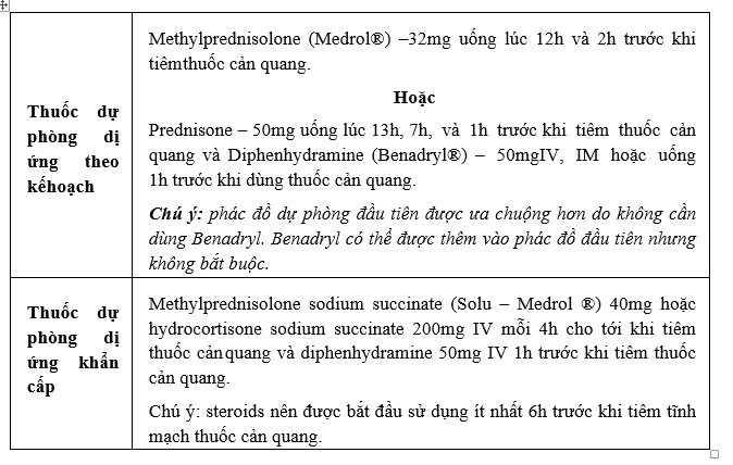 - Thuốc dự phòng dị ứng khẩn cấp: Dùng thuốc phòng dị ứng khẩn cấp chỉ được khuyến cáo dùng cho những bệnh nhân không thể đợi 12h sau mới dùng thuốc cản quang hoặc khi các phương pháp chẩn đoán hình ảnh khác là không thể.