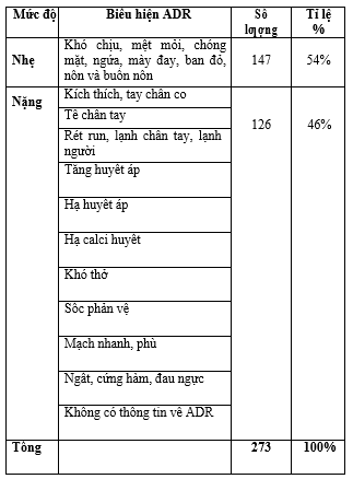 Bảng dưới đây tổng hợp các ADR đã xảy ra khi dùng thuốc cản quang tại Việt Nam