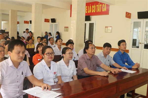 Thầy thuốc nhân dân, Bác sĩ chuyên khoa 2 Nguyễn Viết Đồng, Phó Giám đốc Sở Y tế, Giám đốc bệnh viện (người ngồi thứ 3 từ phải sang) tham dự khai mạc Khám tầm soát ung thư vú miễn phí tại bệnh viện