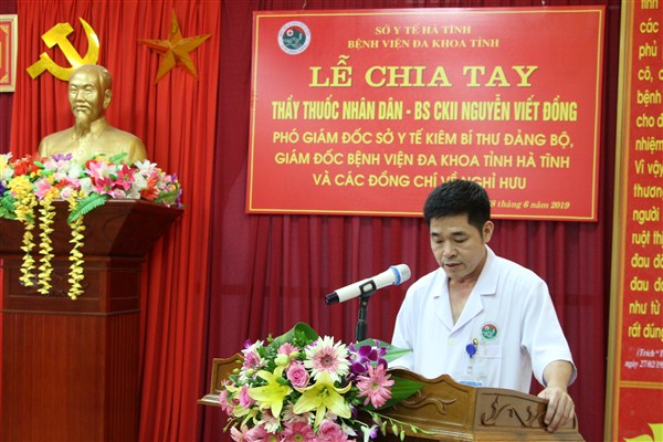 Phát biểu tại buổi lễ, đồng chí Trần Xuân Dâng đánh giá cao những đóng góp của đồng chí Nguyễn Viết Đồng cho bệnh viện nói riêng và ngành y tế tỉnh nhà nói chung. Minh chứng chính là những thành quả mà bệnh viện đã đạt được trong thời gian qua. Mặc dù về nghỉ hưu theo chế độ nhưng đồng chí mong rằng, đồng chí Nguyễn Viết Đồng sẽ tiếp tục quan tâm, sát cánh cùng tập thể Bệnh viện Đa khoa tỉnh.