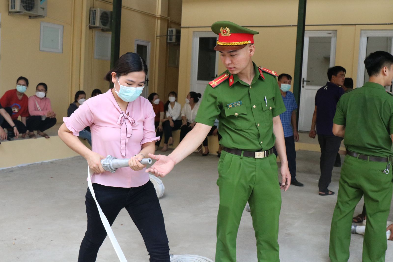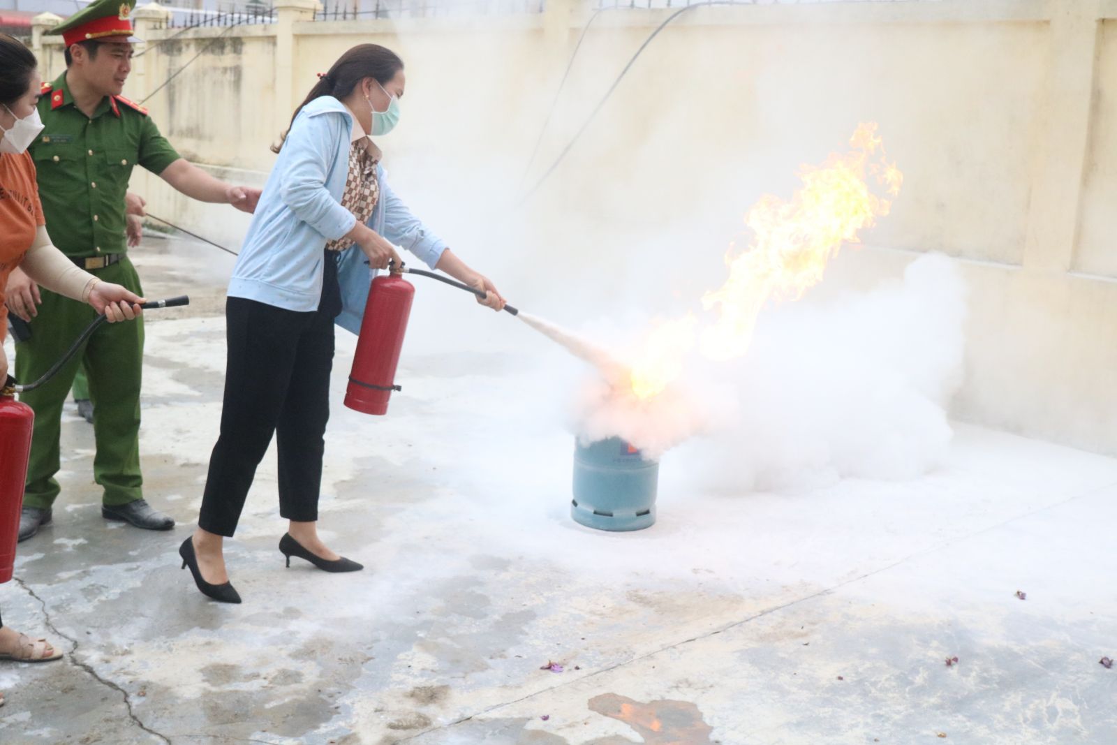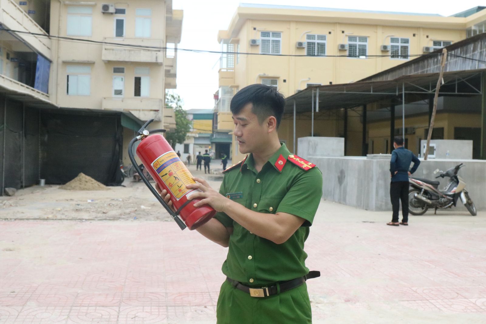 Đại úy Nguyễn Phi Châu hướng dẫn kiểm tra an toàn PCCC giới thiệu các phương tiện, hệ thống PCCC; cấu tạo, tính năng, tác dụng, cách bảo quản, sử dụng các phương tiện chữa cháy được trang bị tại cơ sở.