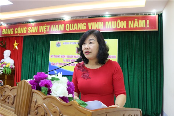 Phát biểu tại lễ mít tinh, Thầy thuốc ưu tú, BSCKII. Vương Kim Đức, Chủ tịch Công đoàn cho biết: Bệnh viện Đa khoa tỉnh có 501/741 cán bộ nữ, tham gia vào tất cả các lĩnh vực, nhiều cán bộ giữ vị trí chủ chốt và luôn đi đầu trong hoạt động chuyên môn, đoàn thể, hoàn thành tốt nhiệm vụ được giao. Đồng chí ghi nhận và tuyên dương các thành tích mà nữ cán bộ, viên chức đã đạt được thời gian qua. Đồng chí nhấn mạnh, đây là dịp để tôn vinh vẻ đẹp, khẳng định vai trò của người phụ nữ trong xã hội nói chung và trong Bệnh viện Đa khoa tỉnh nói riêng và mong muốn các chị em sẽ không ngừng phát huy tinh thần tự chủ, năng động, sáng tạo, thực hiện tốt các nhiệm vụ được giao và chủ động giải quyết tốt mọi công việc gia đình, xứng đáng là người phụ nữ “Giỏi việc nước – Đảm việc nhà”, góp phần vào công cuộc đổi mới đưa bệnh viện ngày càng phát triển.