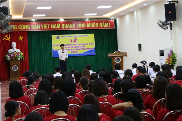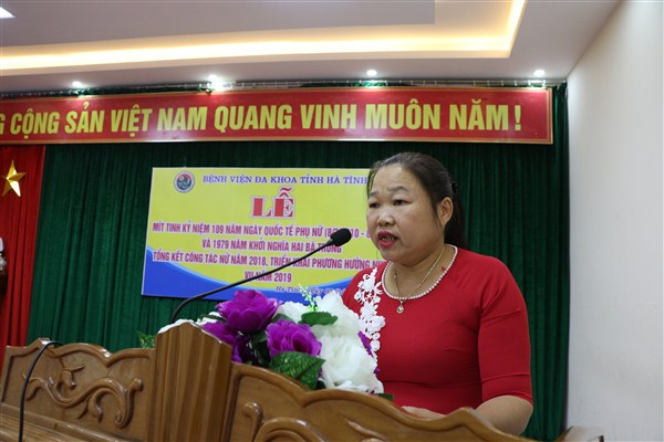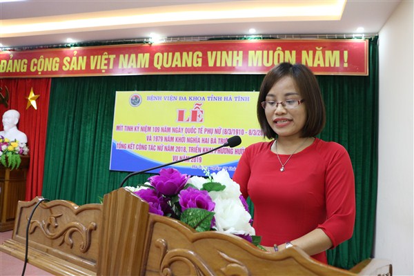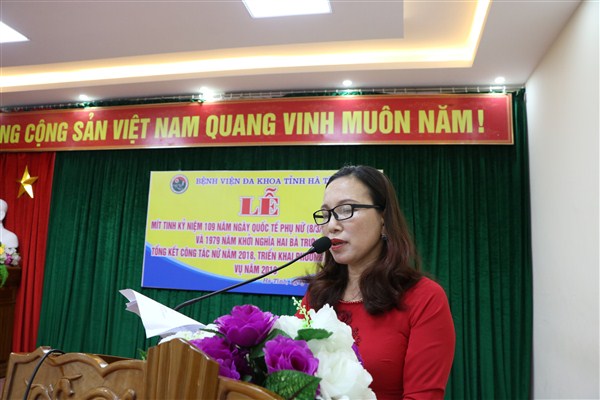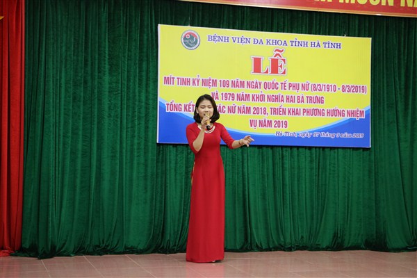Chiều ngày 07/3/2019, Bệnh viện Đa khoa tỉnh Hà Tĩnh tổ chức Mít tinh kỷ niệm 109 năm ngày Quốc tế phụ nữ (8/3/1910 – 8/3/2019), 1979 năm khởi nghĩa Hai Bà Trưng và tổng kết công tác nữ năm 2018, triển khai phương hướng, nhiệm vụ năm 2019.
