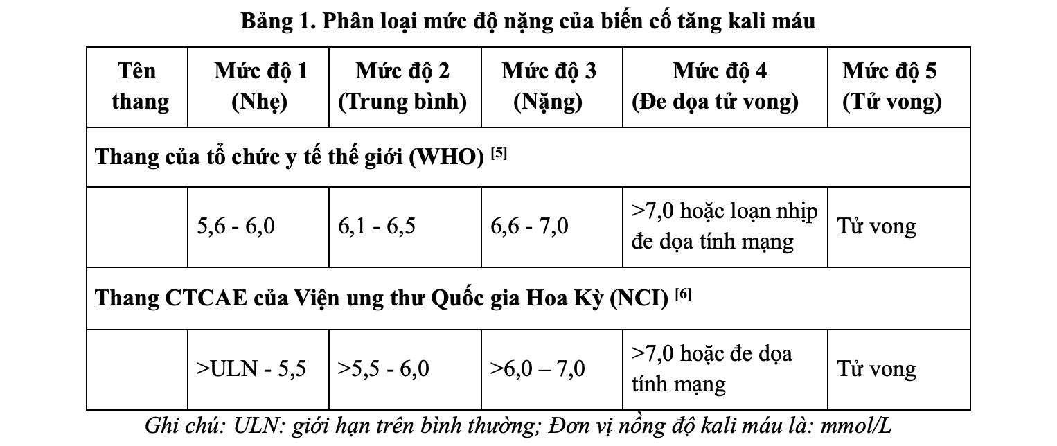 Việc phân loại mức độ nặng của biến cố rối loạn kali máu khác nhau tùy vào ý kiến chủ quan của nhà nghiên cứu nhưng hầu hết đều sử dụng các thang phân loại mức độ biến cố đã được chuẩn hóa. Trong đó, hai thang phân loại thường được sử dụng nhất là thang của Tổ chức Y tế thế giới (WHO) và thang của Viện ung thư Quốc gia Hoa Kỳ (NCI). Chi tiết phân loại mức độ nặng của biến cố rối loạn kali máu theo hai thang này được trình bày trong bảng 1.