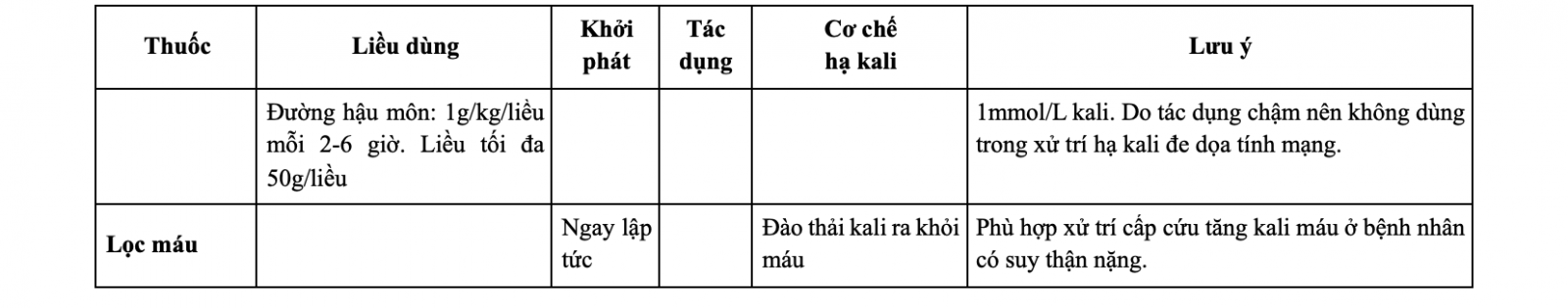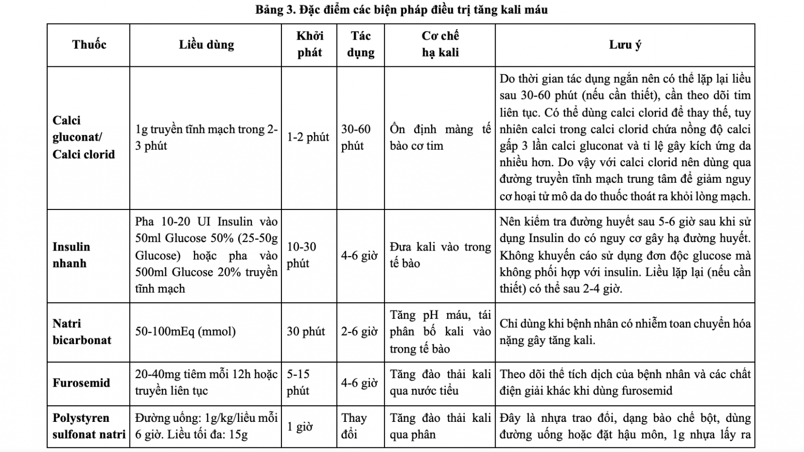 Tăng kali máu là tình huống khẩn cấp, do vậy cần tiến hành ngay xử trí nhanh nhất có thể. Các biện pháp điều trị tăng kali máu gồm: tăng bài niệu đào thải kali, tăng vận chuyển kali từ ngoài vào trong tế bào, dùng các thuốc đối kháng đặc hiệu hoặc lọc máu. Đặc điểm các biện pháp điều trị tăng kali máu được trình bày ở bảng dưới đây: