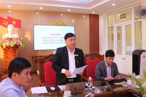 Phát biểu tại buổi Tọa đàm, Đồng chí Hoàng Quang Trung, Bí thư Đảng ủy, Giám đốc Bệnh viện đánh giá cao công tác phối hợp giảng dạy giữa Viện - Trường trong thời gian vừa qua. Trong thời gian tới, để nâng cao chất lượng đào tạo, mặc dù cơ sở vật chất còn chật hẹp, nhân lực còn mỏng, nhưng bệnh viện sẽ cố gắng tạo môi trường học tập tốt nhất nhằm đáp ứng nhu cầu tiếp thu, lĩnh hội kiến thức và trải nghiệm các bài học thực hành nhằm nâng cao chất lượng học tập của học sinh, sinh viên. Đồng chí cảm ơn và mong muốn các giảng viên của nhà trường tiếp tục công tác khám, chữa bệnh ở các khoa lâm sàng, tích cực tham gia nghiên cứu khoa học, xây dựng bệnh viện ngày càng phát triển.