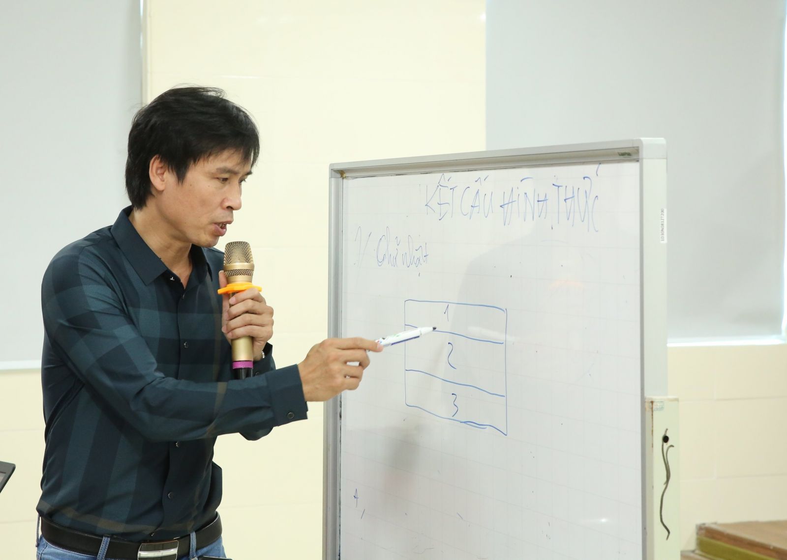 Nhà báo Trần Long, Trưởng phòng Chuyên đề - Đài Phát thanh và truyền hình tỉnh truyền đạt các kiến thức cơ bản cho học viên