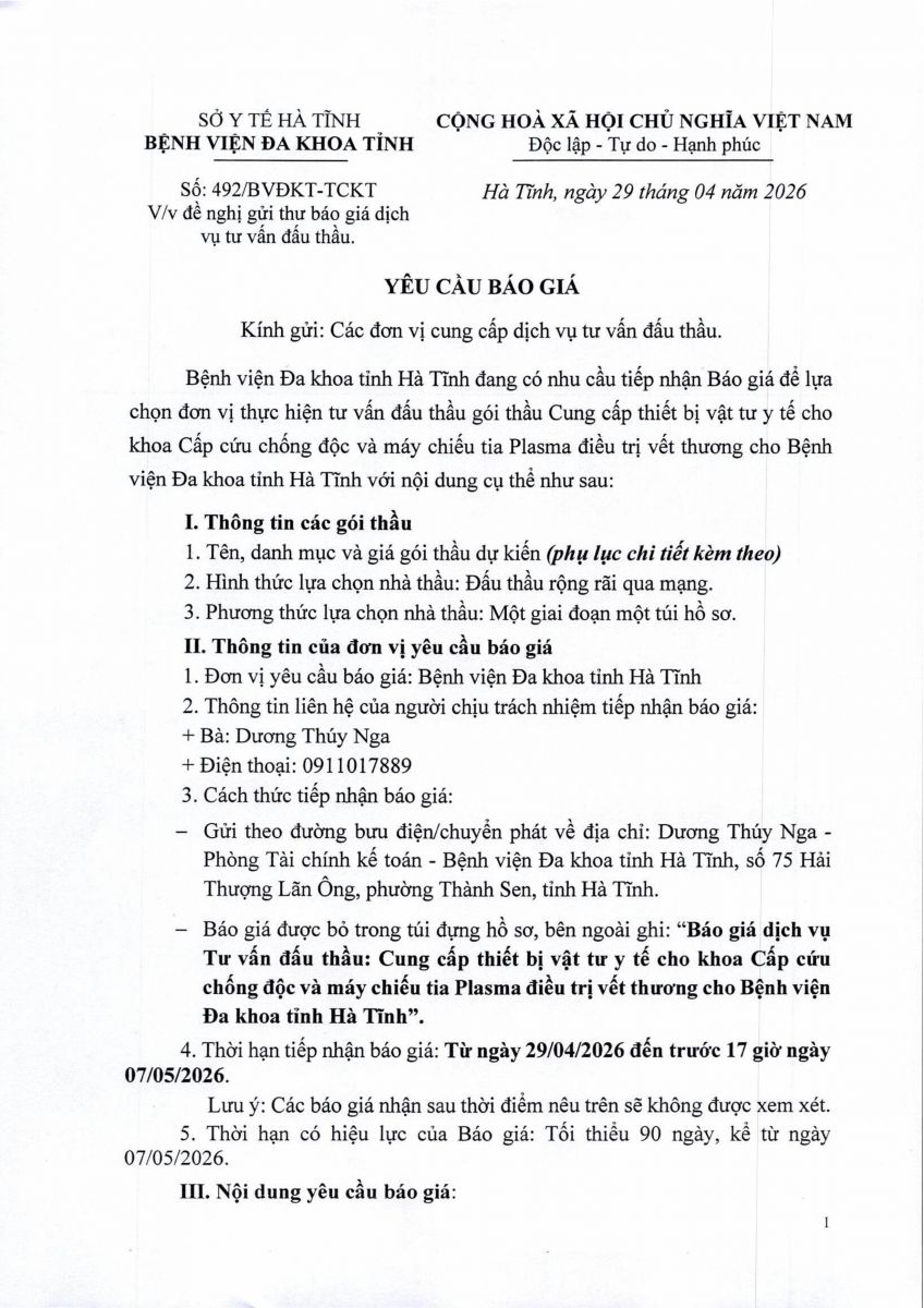 Bệnh viện Đa khoa tỉnh Hà Tĩnh đang có nhu cầu tiếp nhận Báo giá để lựa chọn đơn vị thực hiện tư vấn đấu thầu gói thầu Cung cấp thiết bị vật tư y tế cho khoa Cấp cứu chống độc và máy chiếu tia Plasma điều trị vết thương cho Bệnh viện Đa khoa tỉnh Hà Tĩnh với nội dung cụ thể như sau: