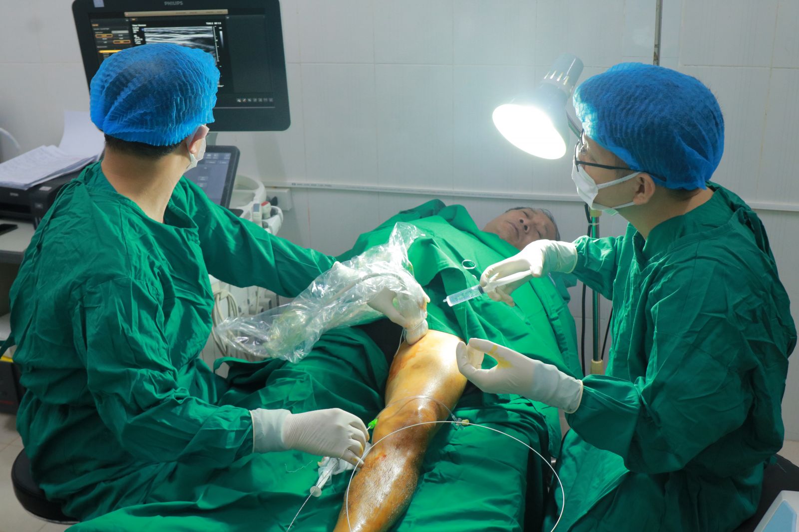 Các bác sĩ thực hiện phương pháp điều trị suy giãn tĩnh mạch chi dưới bắng laser nội mạch
