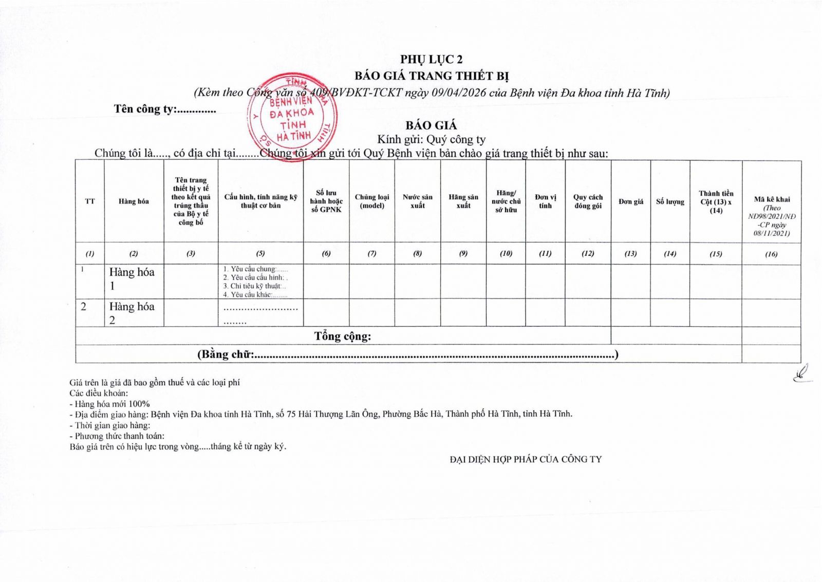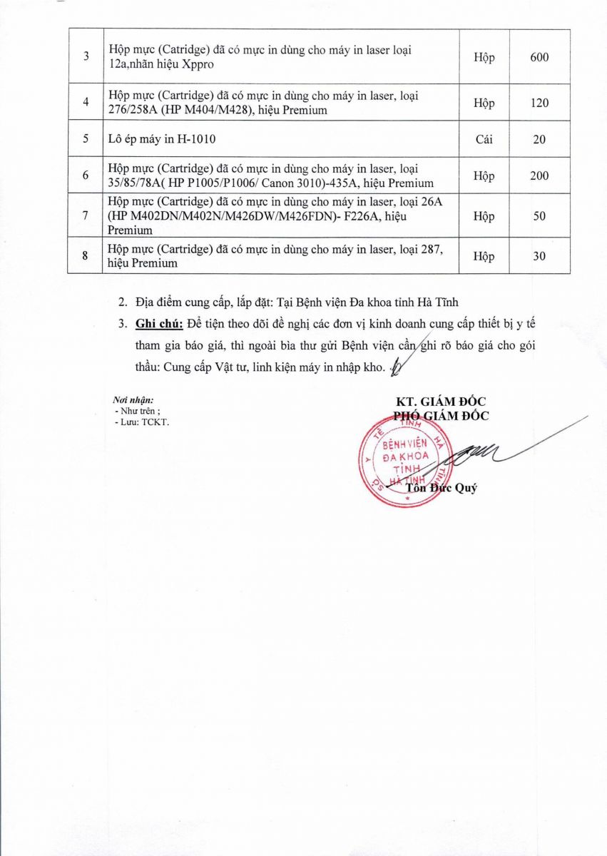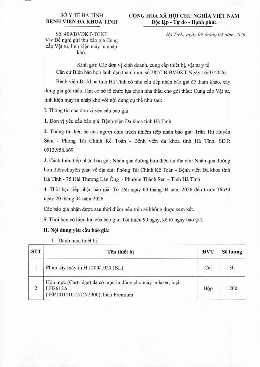 Căn cứ Biên bản họp lãnh đạo tham mưu số 282/TB-BVĐKT Ngày 16/03/2026. Bệnh viện Đa khoa tỉnh Hà Tĩnh có nhu cầu tiếp nhận báo giá để tham khảo, xây dựng giá gói thầu, làm cơ sở tổ chức lựa chọn nhà thầu cho gói thầu: Cung cấp Vật tư, linh kiện máy in nhập kho với nội dung cụ thể như sau: