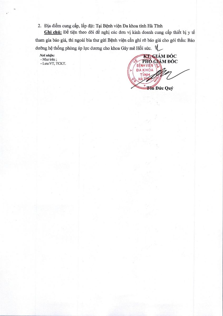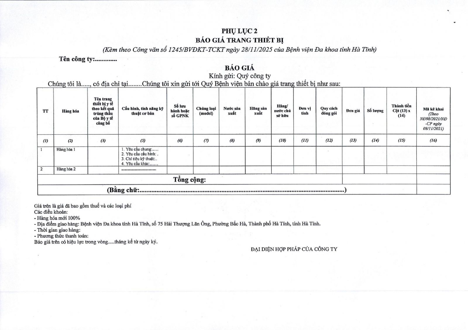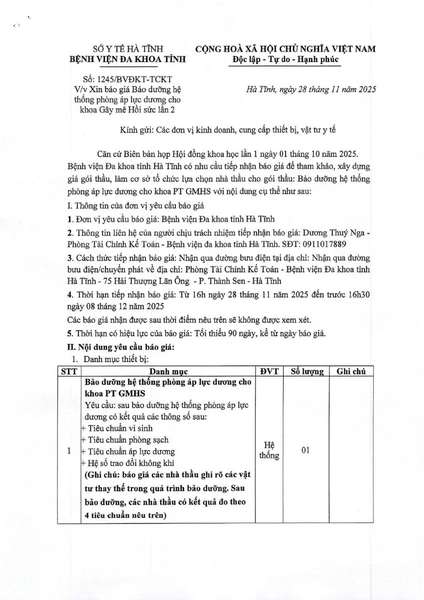 Căn cứ Biên bản họp Hội đồng khoa học lần 1 ngày 01 tháng 10 năm 2025. Bệnh viện Đa khoa tỉnh Hà Tĩnh có nhu cầu tiếp nhận báo giá để tham khảo, xây dựng giá gói thầu, làm cơ sở tổ chức lựa chọn nhà thầu cho gói thầu: Bảo dưỡng hệ thống phòng áp lực dương cho khoa PT Gây mê hồi sức với nội dung cụ thể như sau: