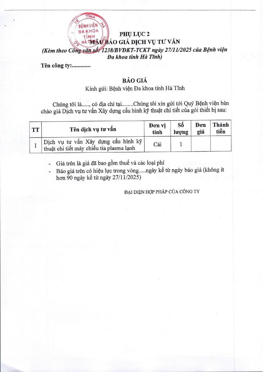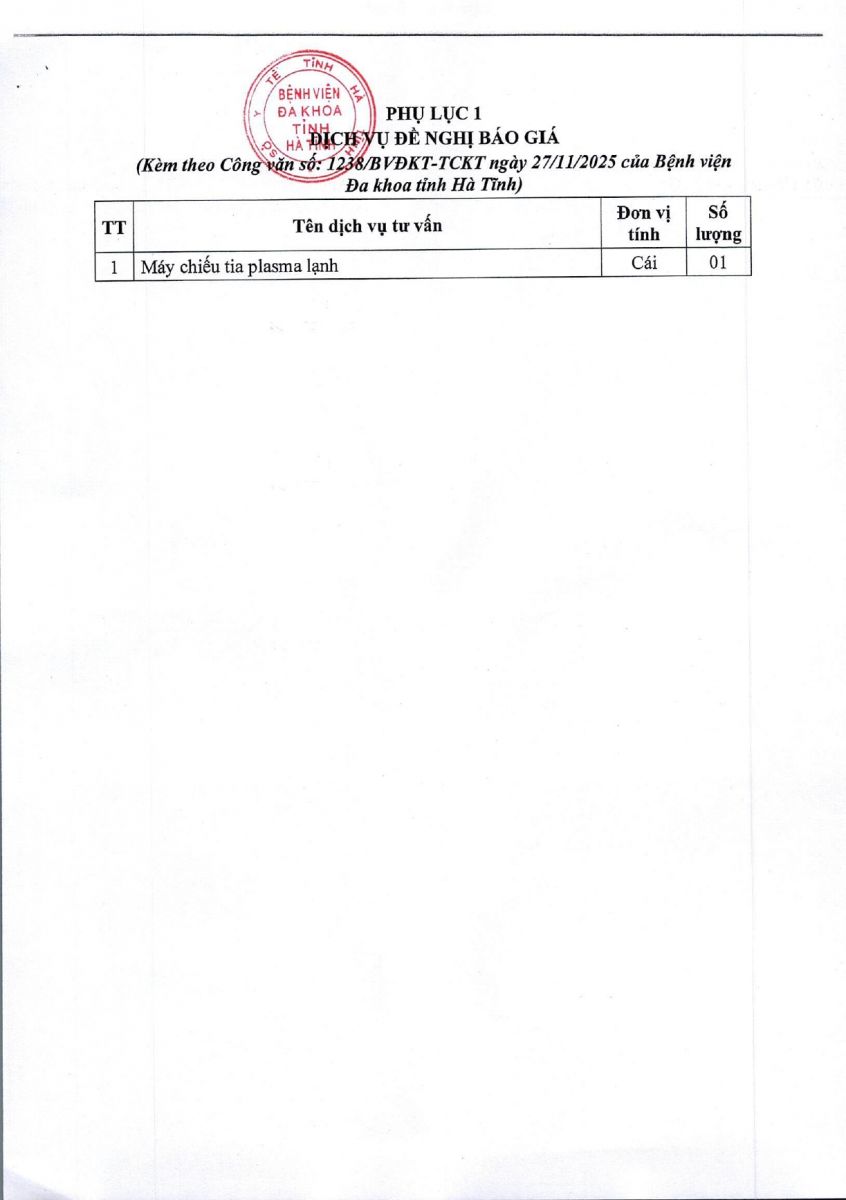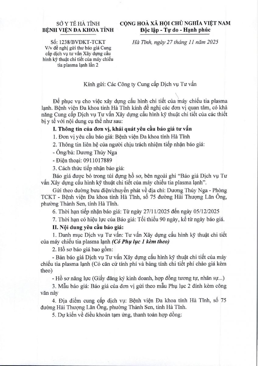 Để phục vụ cho việc xây dựng cấu hình chi tiết của máy chiếu tia plasma lạnh. Bệnh viện Đa khoa tỉnh Hà Tĩnh kính đề nghị các đơn vị quan tâm, có khả năng Cung cấp Dịch vụ Tư vấn Xây dựng cấu hình kỹ thuật chi tiết của các thiết bị y tế với nội dung cụ thể như sau: