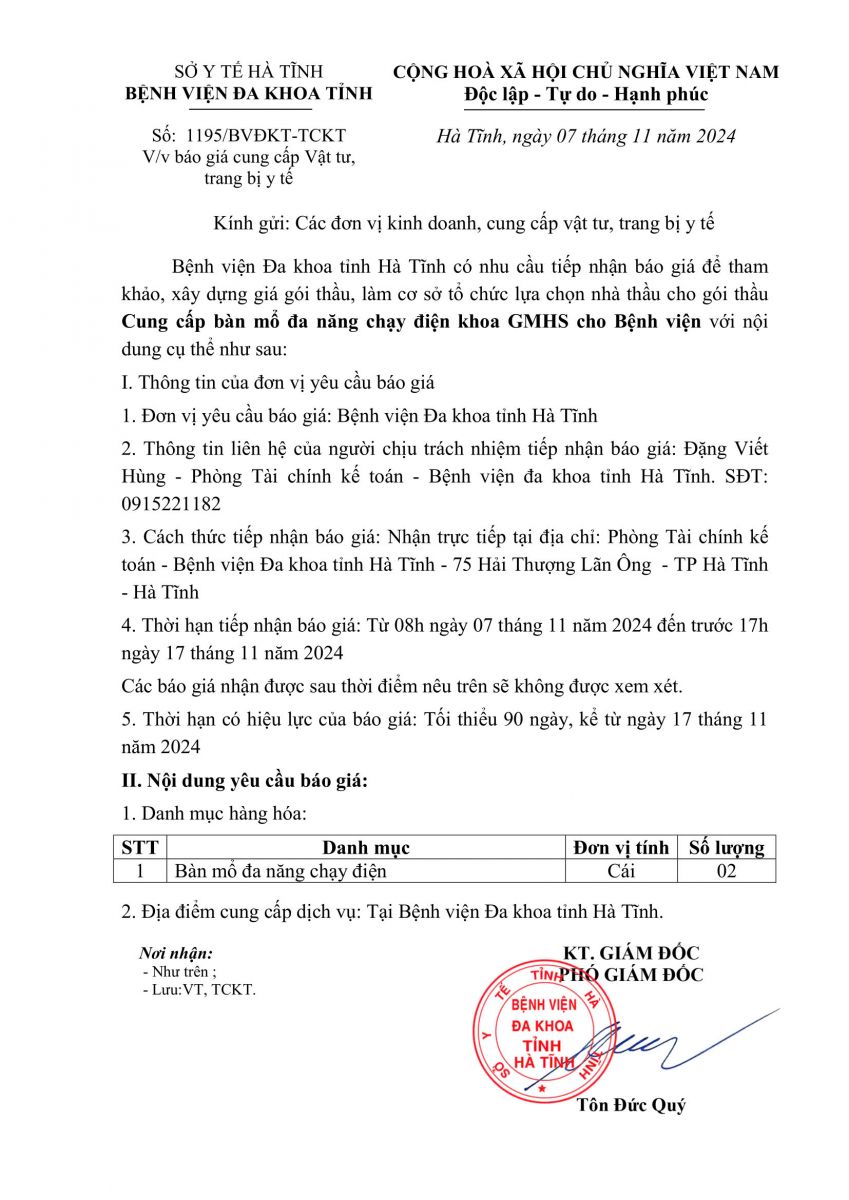 Bệnh viện Đa khoa tỉnh Hà Tĩnh có nhu cầu tiếp nhận báo giá để tham khảo, xây dựng giá gói thầu, làm cơ sở tổ chức lựa chọn nhà thầu cho gói thầu Cung cấp bàn mổ đa năng chạy điện khoa GMHS cho Bệnh viện với nội dung cụ thể như sau: