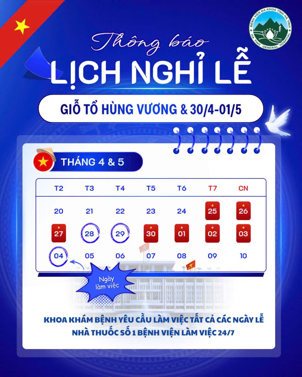 Bệnh viện Đa khoa tỉnh Hà Tĩnh trân trọng thông báo đến quý bệnh nhân lịch khám chữa bệnh trong dịp lễ Giỗ tổ Hùng Vương, Giải phóng Miền nam 30/4 và Quốc tế Lao động 01/5 tại bệnh viện.