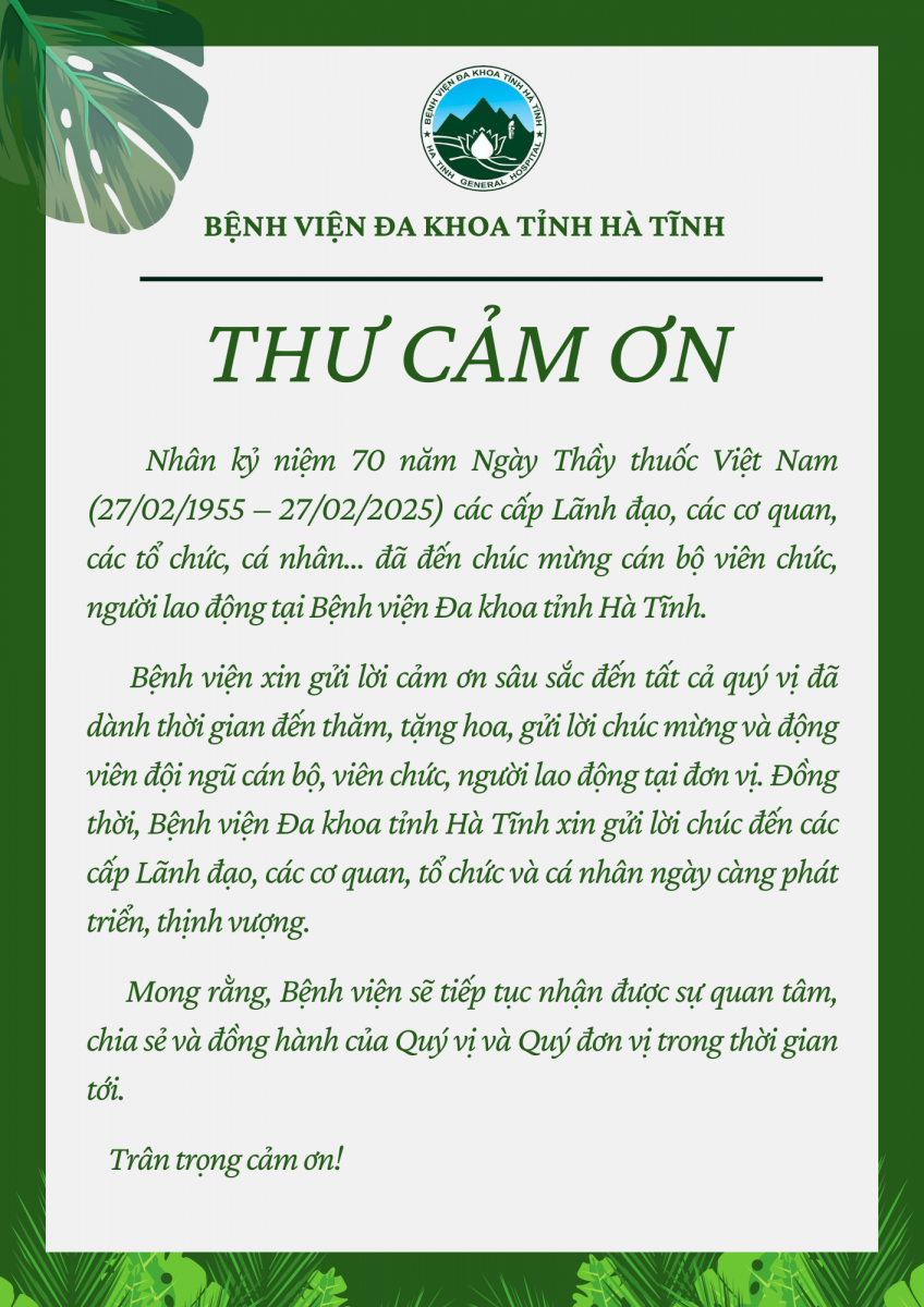 Bệnh viện xin gửi lời cảm ơn sâu sắc đến tất cả quý vị đã dành thời gian đến thăm, tặng hoa, gửi lời chúc mừng và động viên đội ngũ cán bộ, viên chức, người lao động tại đơn vị. Đồng thời, Bệnh viện Đa khoa tỉnh Hà Tĩnh xin gửi lời chúc đến các cấp Lãnh đạo, các cơ quan, tổ chức và cá nhân ngày càng phát triển, thịnh vượng.