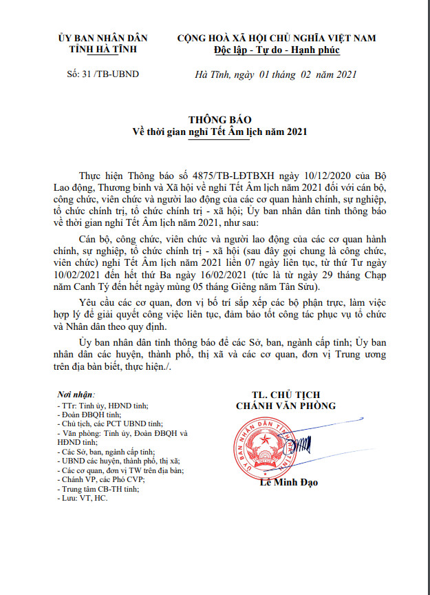 UBND tỉnh: Thông báo về thời gian nghỉ Tết âm lịch năm 2021
