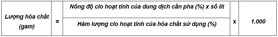 5.1. Lượng hóa chất chứa Clo cần để pha số lít dung dịch với nồng độ Clo hoạt tính theo yêu cầu được tính theo công thức sau:
