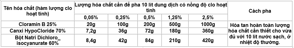 - Để pha 10 lít dung dịch có nồng độ clo hoạt tính 0,5% từ bột Cloramin B 25% Clo hoạt tính, cần: (0,5 x 10/25) x 1.000 = 200 gam.