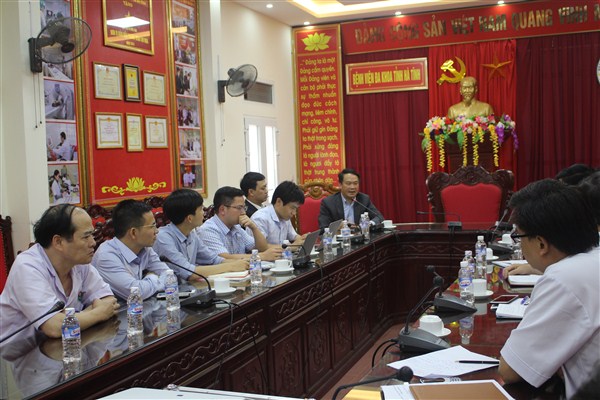 Tại buổi làm việc, TS.BS. Lê Văn Dũng, Trưởng khoa Tim mạch - Lão học báo cáo thực trạng khám, chữa bệnh chuyên ngành tim mạch tại Bệnh viện Đa khoa tỉnh Hà Tĩnh. Đồng chí đã nêu ra những mong muốn, định hướng phát triển chuyên ngành tim mạch của Bệnh viện Đa khoa tỉnh trong tương lai gần, như: Siêu âm tim nâng cao, Siêu âm mạch máu phát triển điều trị suy giãn tĩnh mạch bằng lazer, Chụp và can thiệp động mạch vành khi có máy DSA, Cấy máy CRT cho một số bệnh nhân suy tim khi có chỉ định,...